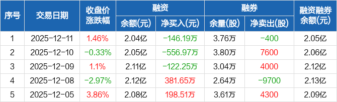 融资方面,当日融资买入1320.5万元,融资偿还1466.69万元,融资净偿还146.19万元,连续3日净偿还累计825.41万元。融券方面,融券卖出3500股,融券偿还3900股,融券余量3.76万股,融券余额104.42万元。融资融券余额合计2.05亿元。