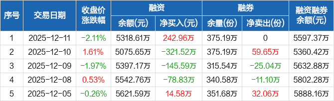 旅游ETF:融资净买入242.96万元,融资余额5318.61万元(12-11)