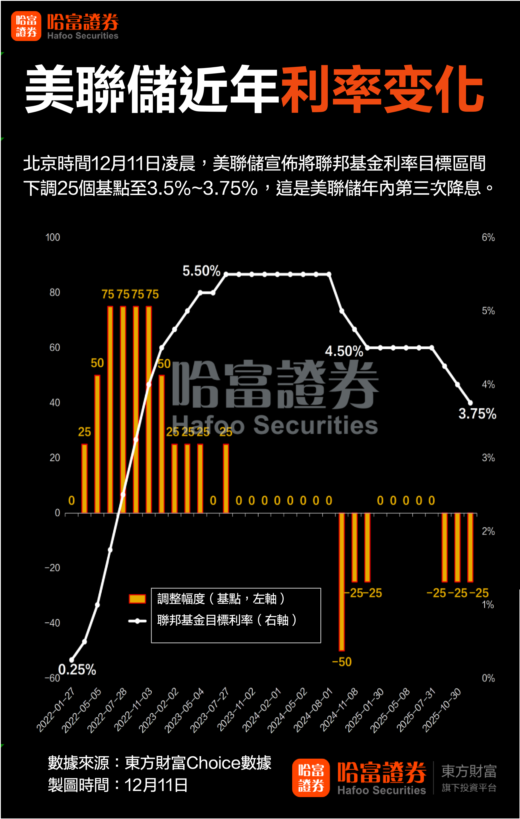 北京时间12月11日凌晨,美联储宣布将联邦基金利率目标区间下调25个基点,这是美联储年内第三次降息,也是本轮降息周期启动后的第六次降息。今年美联储已累计降息75个基点,联邦基金目标利率上限从4.50%降至3.75%。