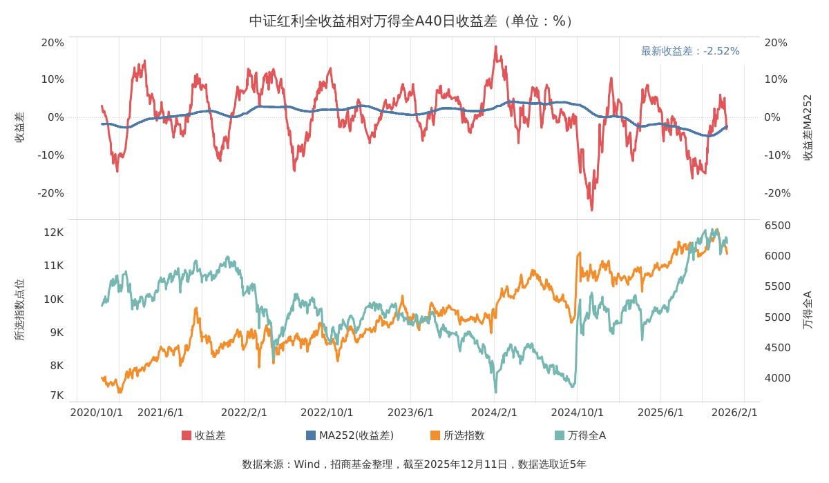 值得关注的是,Wind数据显示,二级市场上,近期红利板块随大市调整,中证红利全收益相对万得全A40日收益差再度跌破零轴。
