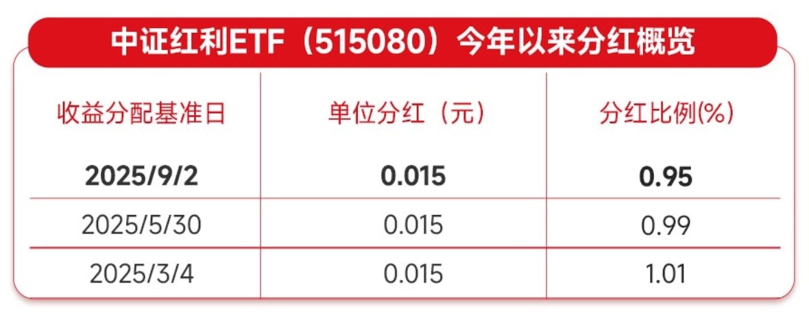 今年以来中证红利ETF(515080)采取季度评估分红节奏,前三季度分红比例分别为1.01%、0.99%、0.95%,近期该ETF也即将迎来四季度评估分红结果。