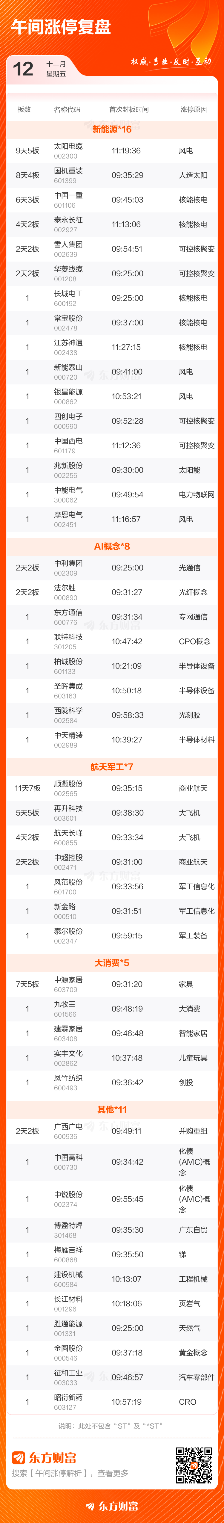 12月12日午间涨停复盘:52股涨停 太阳电缆9天5板
