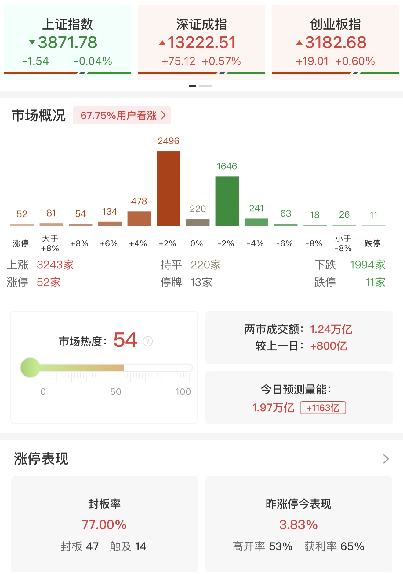 财联社12月12日电,市场早盘探底回升,创业板指盘中涨超1%,此前一度跌近1%。沪深两市半日成交额1.24万亿,较上个交易日放量800亿。盘面上热点快速轮动,全市场超3200只个股上涨。从板块来看,商业航天概念延续强势,再升科技等十余股涨停。算力硬件概念表现活跃,联特科技20cm涨停。电网设备概念快速拉升,中国西电、中能电气等多股涨停。下跌方面,零售概念集体下挫,中央商场跌停。板块方面,电网设备、贵金属、商业航天等板块涨幅居前,零售、海南、港口航运等板块跌幅居前。截至收盘,沪指跌0.04%,深成指涨0.57%,创业板指涨0.6%。