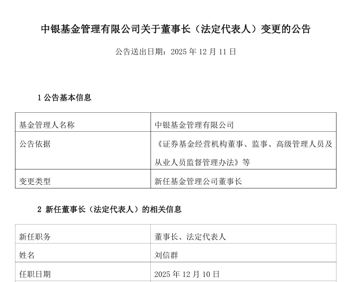 又一家公募巨头迎来新任掌门人。中银基金最新发布公告称,自12月10日起,刘信群出任公司董事长、法定代表人,总经理张家文不再代任董事长一职。