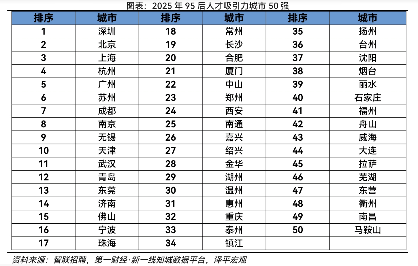 近日,智联招聘联合泽平宏观联合发布《中国城市95后人才吸引力排名:2025》。数据显示,凭借突出的创新产业结构和人才友好型的城市环境,深圳已连续三年位居该榜单榜首。与此同时,广东省内多城在榜单中都有亮眼表现,全省共有7座城市跻身95后人才吸引力50强,珠三角城市群对95后人才的集聚效应显著高于全国平均水平。