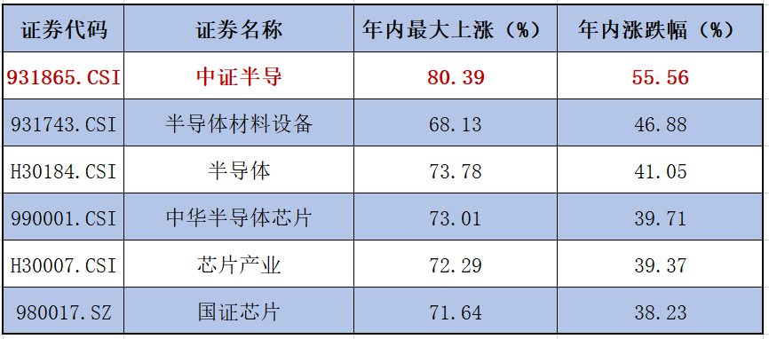 数据显示,截至12月11日,中证半导2025年年内涨幅55.56%,区间最大上涨超80%,在中证全指半导体、中华半导体芯片、国证芯片等主流半导体指数中位列第一。