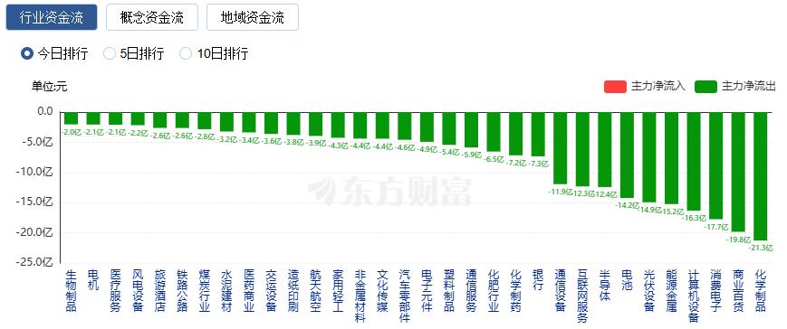 净流出方面,化学制品、商业百货、消费电子等净流出排名靠前,其中化学制品净流出21.28亿元。