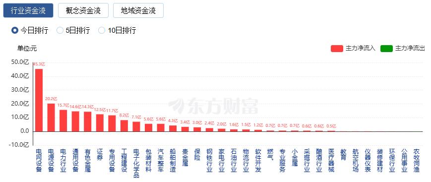 行业资金方面,截至收盘,电网设备、电源设备、电力行业等净流入排名靠前,其中电网设备净流入45.29亿。