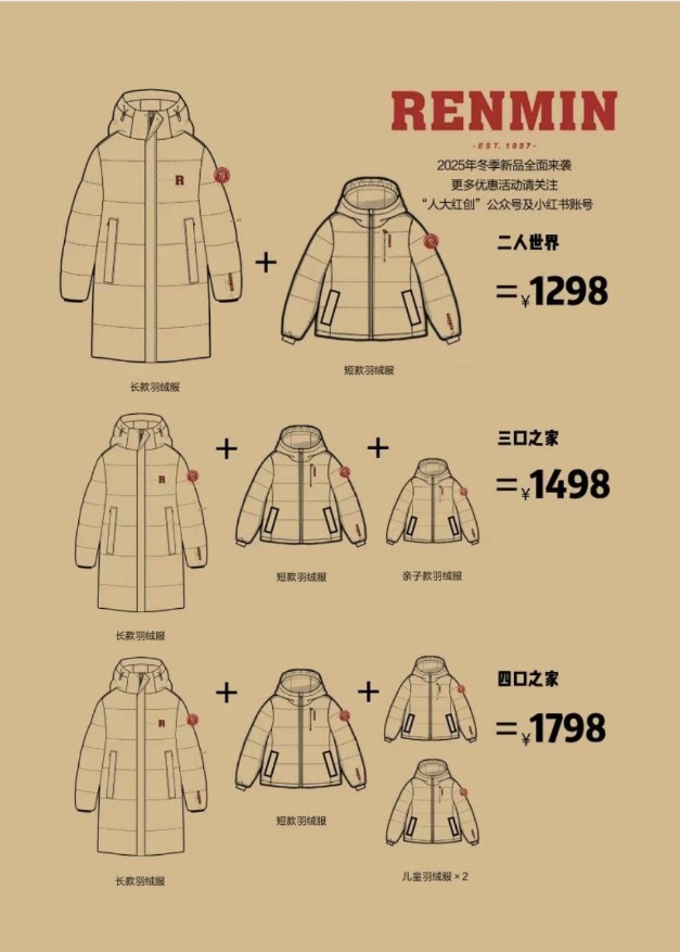 预售页面显示,现在花9.9元可预定人大新款羽绒服,有红色、黑色、米色、蓝色(儿童款)可选。899元可购买任一款羽绒服,若加399元,可多购一件短款羽绒服。此外,店内还提供适合三口之家(长款+短款+亲子款)和四口之家(长款+短款+两件儿童羽绒服)的家庭套餐,售价分别是1398元和1798元。若以四口之家的价格计算,平均每件接近450元。除线上渠道外,人大红创位于北京的三家门店也有售卖。