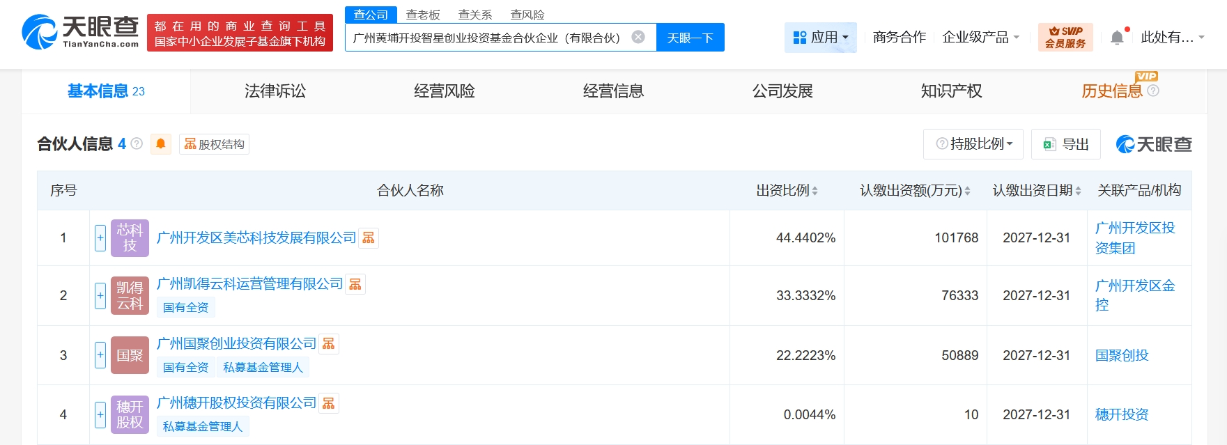 每经AI快讯,天眼查App显示,近日,广州黄埔开投智星创业投资基金合伙企业(有限合伙)成立,执行事务合伙人为广州穗开股权投资有限公司,出资额22.9亿元人民币,经营范围为以自有资金从事投资活动,创业投资,以私募基金从事股权投资、投资管理、资产管理等活动。合伙人信息显示,该基金由广州开发区美芯科技发展有限公司、广州凯得云科运营管理有限公司、广州国聚创业投资有限公司、广州穗开股权投资有限公司共同出资。