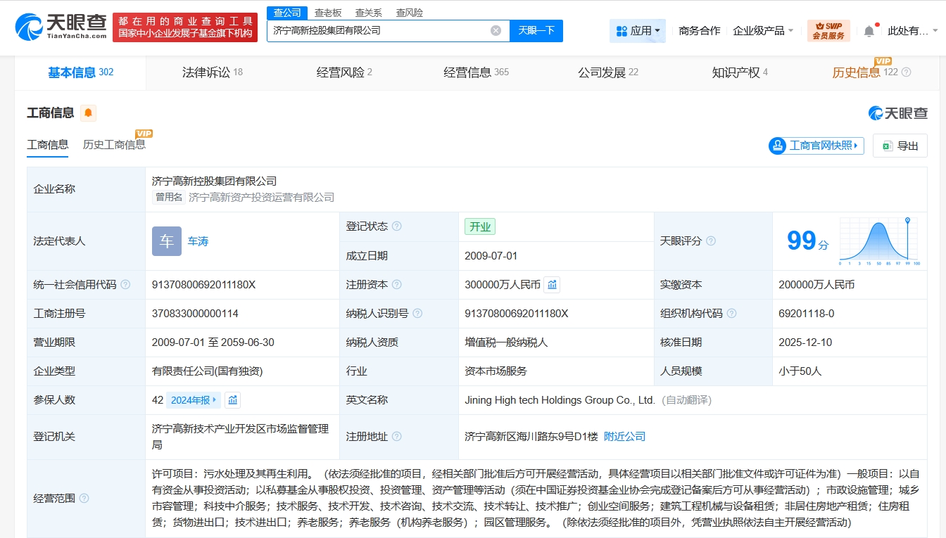 每经AI快讯,天眼查App显示,近日,济宁高新控股集团有限公司发生工商变更,注册资本由20亿元人民币增至30亿元人民币,增幅50%。该公司成立于2009年7月,法定代表人为车涛,经营范围含污水处理及其再生利用,以自有资金从事投资活动,以私募基金从事股权投资、投资管理、资产管理等活动,市政设施管理,城乡市容管理等。股东信息显示,该公司由济宁高新技术产业开发区国有资产监督管理局全资持股。