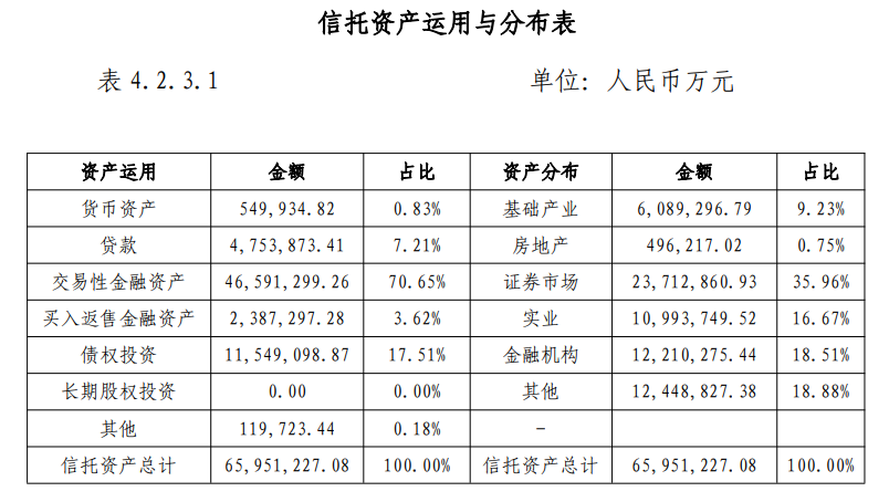 年报数据显示,交银国信2024年实现合并报表口径下营业收入13.96亿元,净利润7.92亿元。截至2024年末,交银国信总资产191.23亿元,信托资产规模6595.12亿元。从信托资产分布来看,证券市场占比最高,为35.96%,此外其他、金融机构、实业分别占比18.88%、18.51%、16.67%。