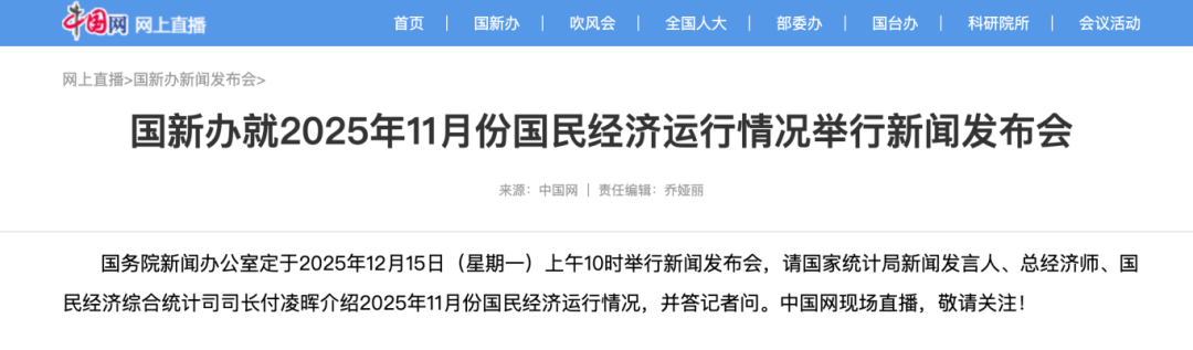 据中国网消息,国务院新闻办公室定于2025年12月15日(星期一)上午10时举行新闻发布会,国家统计局新闻发言人、总经济师、国民经济综合统计司司长付凌晖介绍2025年11月份国民经济运行情况,并答记者问。