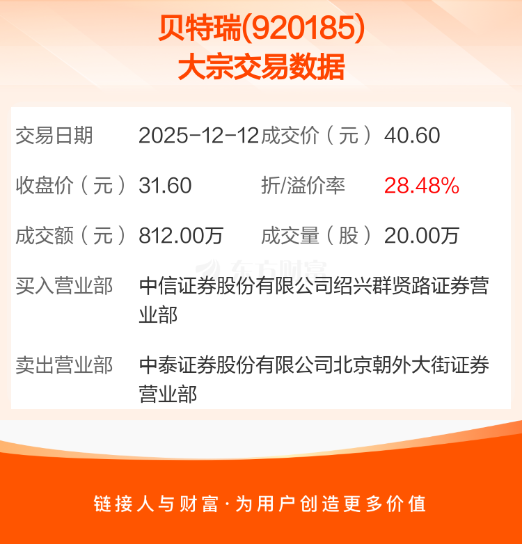 该笔大宗交易成交均价40.60元,较该股当日收盘价31.60元溢价28.48%。
