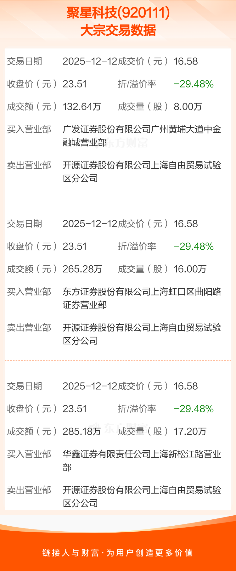 2025年12月12日,聚星科技发生3笔大宗交易,共成交41.20万股,成交金额683.10万元,占其流通市值比例为0.39%。
