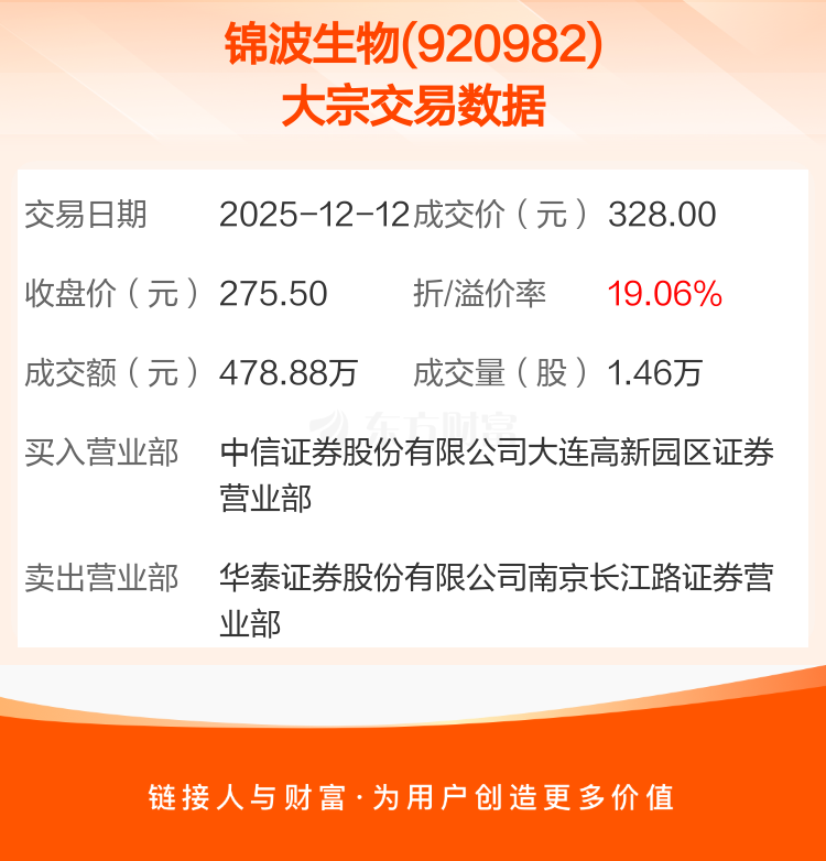 大宗交易:锦波生物成交478.88万元,溢价19.06%(12-12)