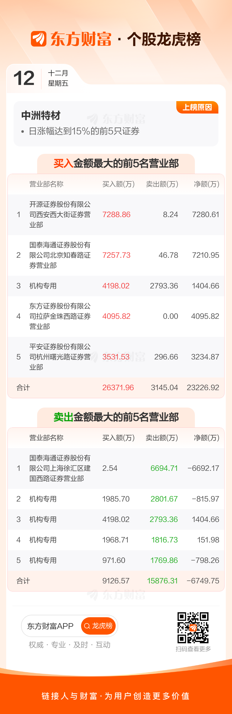 交易所2025年12月12日公布的交易公开信息显示,中洲特材因成为日涨幅达到15%的前5只证券上榜。中洲特材当日收报23.39元,涨跌幅20.01%,偏离值20.00%,换手率28.24%,成交额17.65亿。