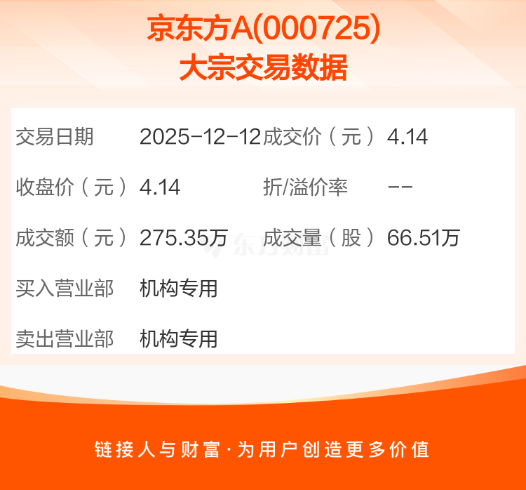 2025年12月12日,京东方A发生1笔大宗交易,共成交66.51万股,成交金额275.35万元,占其流通市值比例为0.00%。