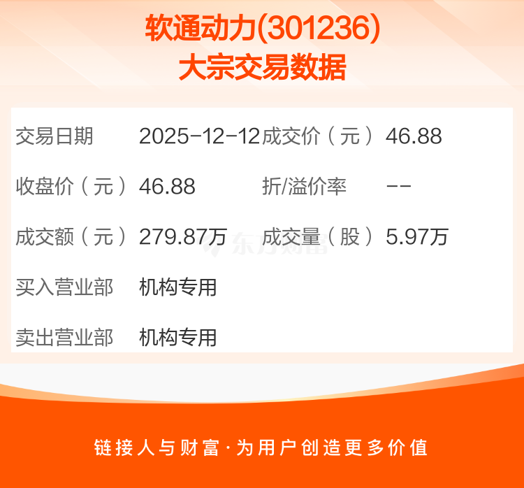 2025年12月12日,软通动力发生1笔大宗交易,共成交5.97万股,成交金额279.87万元,占其流通市值比例为0.01%。
