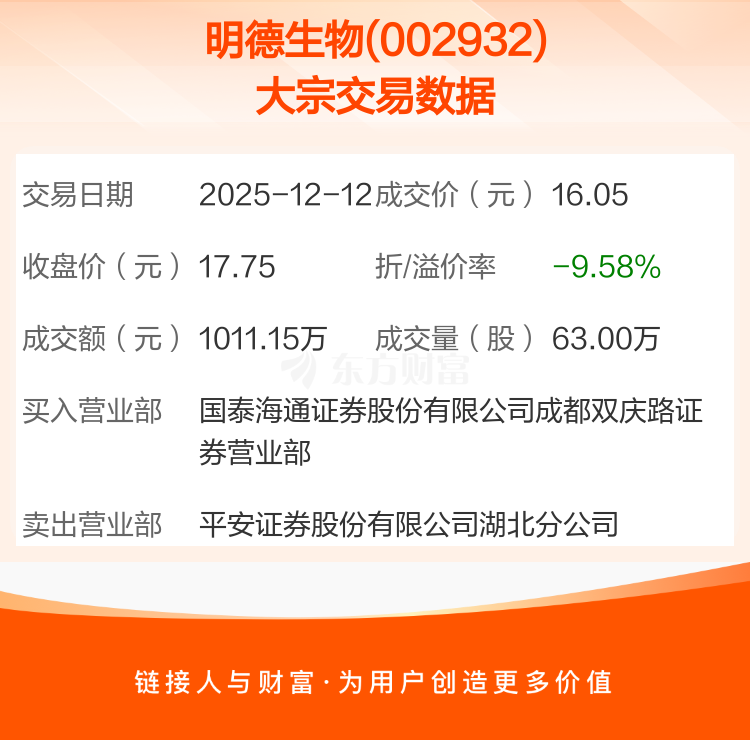 2025年12月12日,明德生物发生1笔大宗交易,共成交63.00万股,成交金额1011.15万元,占其流通市值比例为0.36%。