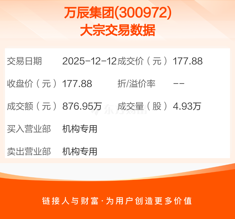2025年12月12日,万辰集团发生1笔大宗交易,共成交4.93万股,成交金额876.95万元,占其流通市值比例为0.03%。