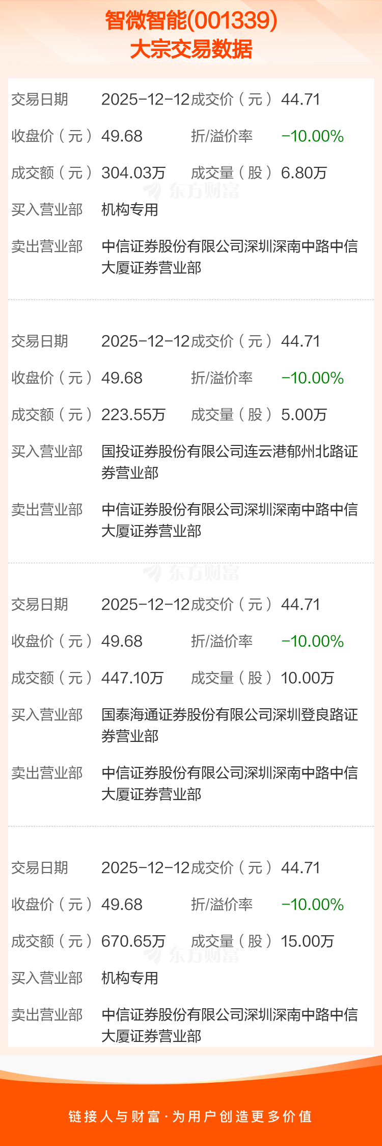 2025年12月12日,智微智能发生4笔大宗交易,共成交36.80万股,成交金额1645.33万元,占其流通市值比例为0.28%。