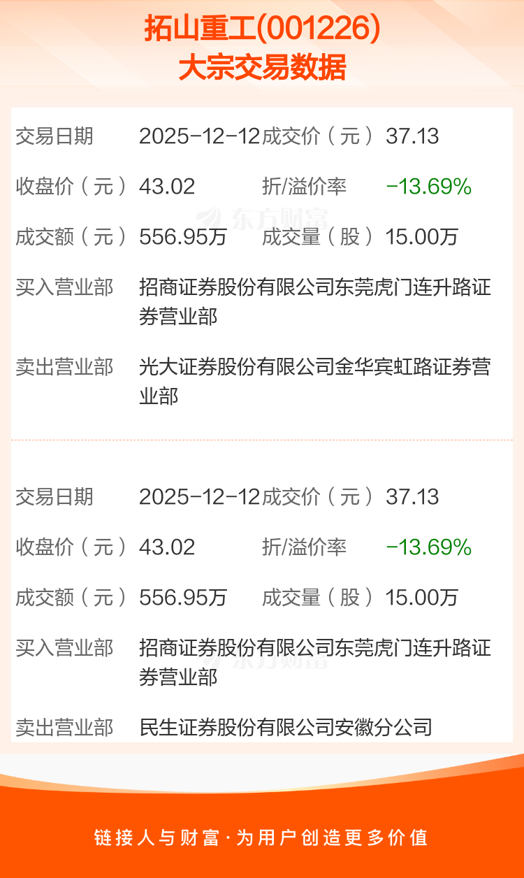 2025年12月12日,拓山重工发生2笔大宗交易,共成交30.00万股,成交金额1113.90万元,占其流通市值比例为0.76%。