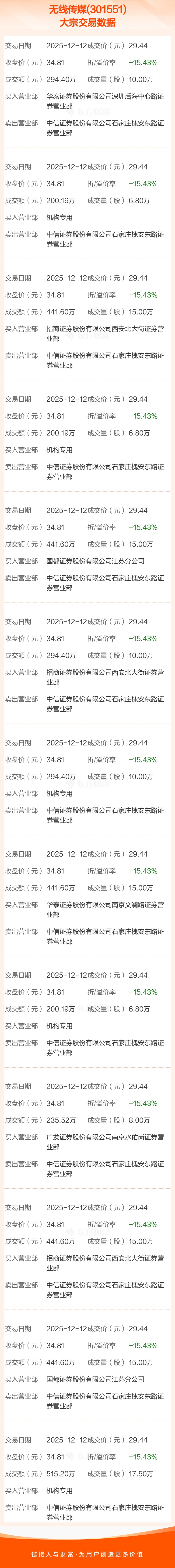 2025年12月12日,无线传媒发生13笔大宗交易,共成交150.90万股,成交金额4442.49万元,占其流通市值比例为0.83%。