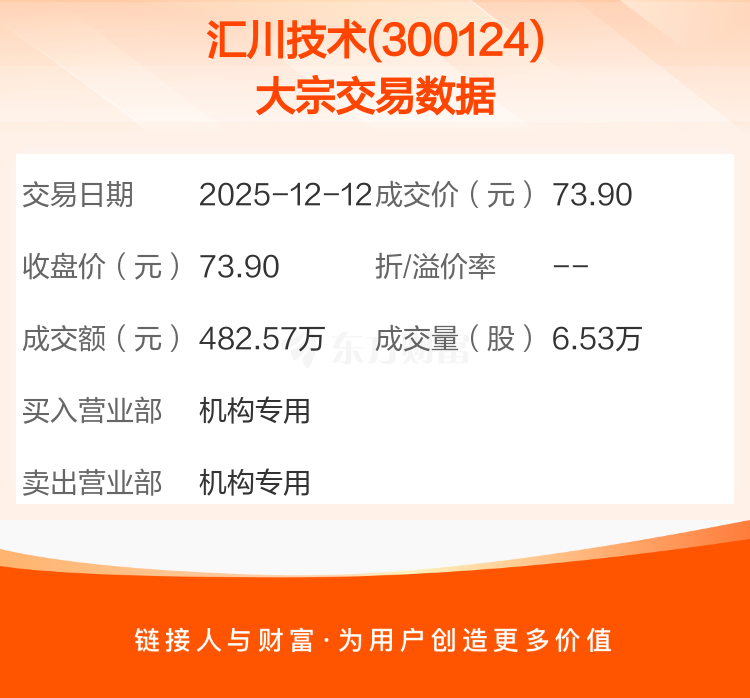 2025年12月12日,汇川技术发生1笔大宗交易,共成交6.53万股,成交金额482.57万元,占其流通市值比例为0.00%。