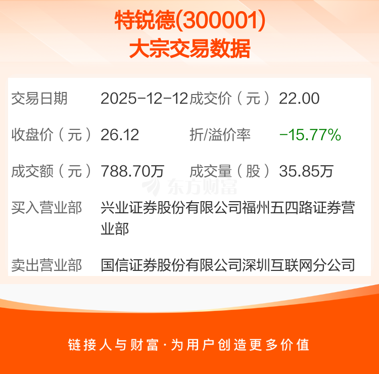 大宗交易:特锐德成交788.70万元,折价15.77%(12-12)