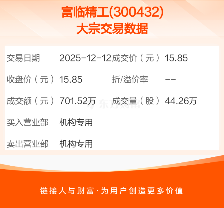 2025年12月12日,富临精工发生1笔大宗交易,共成交44.26万股,成交金额701.52万元,占其流通市值比例为0.03%。