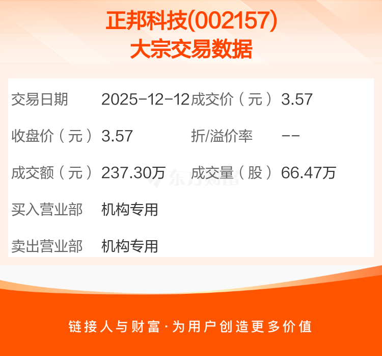 2025年12月12日,正邦科技发生1笔大宗交易,共成交66.47万股,成交金额237.30万元,占其流通市值比例为0.01%。