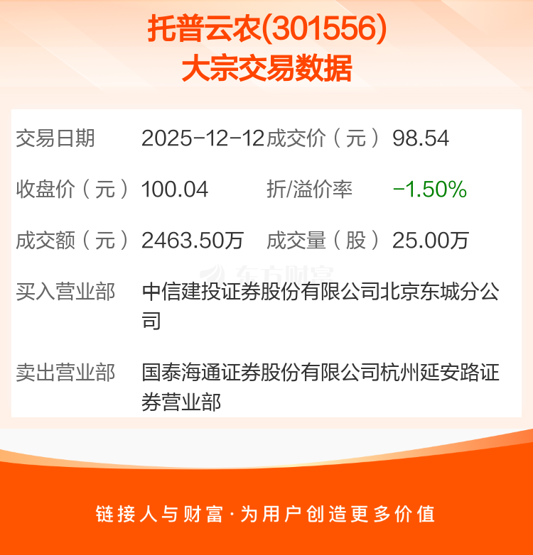 2025年12月12日,托普云农发生1笔大宗交易,共成交25.00万股,成交金额2463.50万元,占其流通市值比例为0.84%。