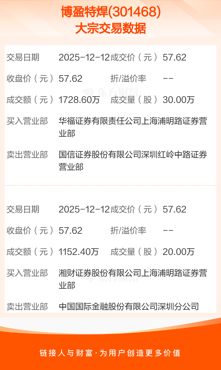 2025年12月12日,博盈特焊发生2笔大宗交易,共成交50.00万股,成交金额2881.00万元,占其流通市值比例为0.67%。