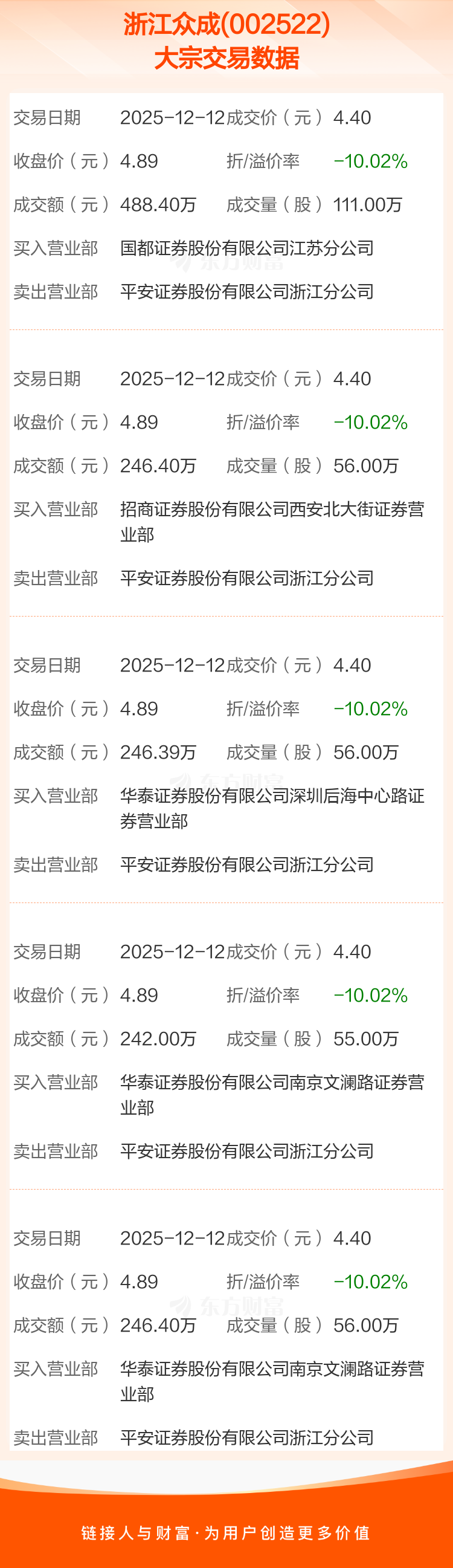 2025年12月12日,浙江众成发生5笔大宗交易,共成交334.00万股,成交金额1469.59万元,占其流通市值比例为0.33%。