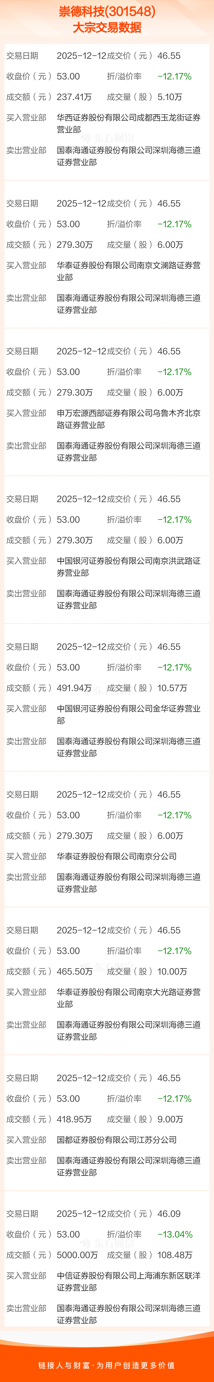 2025年12月12日,崇德科技发生9笔大宗交易,共成交167.15万股,成交金额7731.00万元,占其流通市值比例为5.56%。