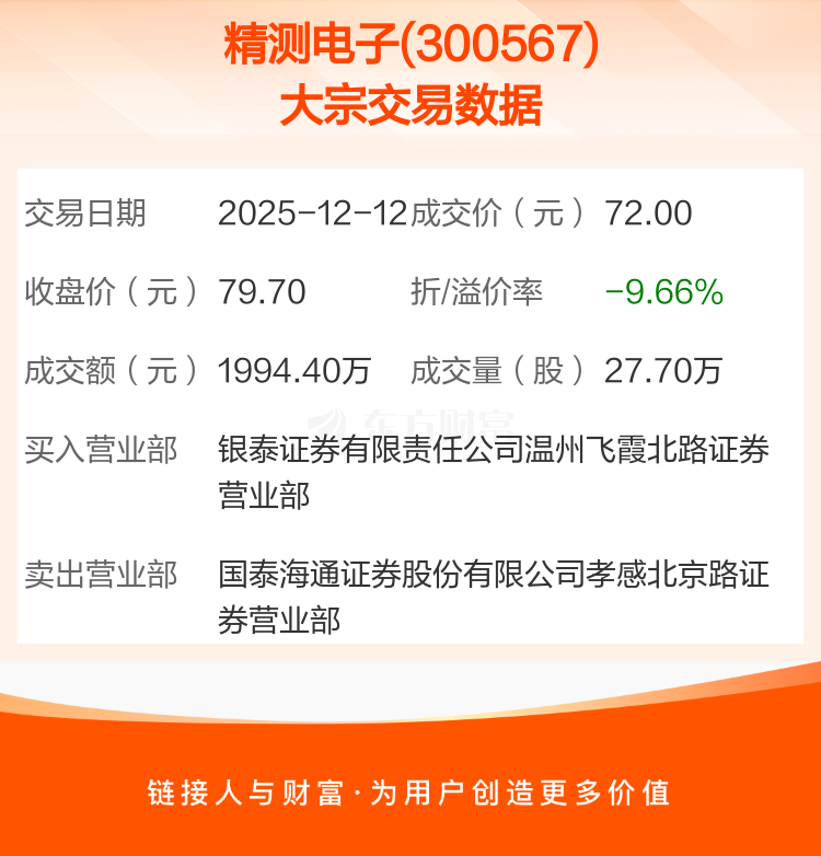 大宗交易:精测电子成交1994.40万元,折价9.66%(12-12)