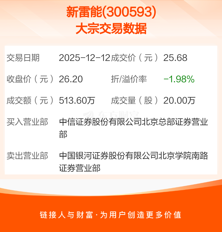 大宗交易:新雷能成交513.60万元,折价1.98%(12-12)