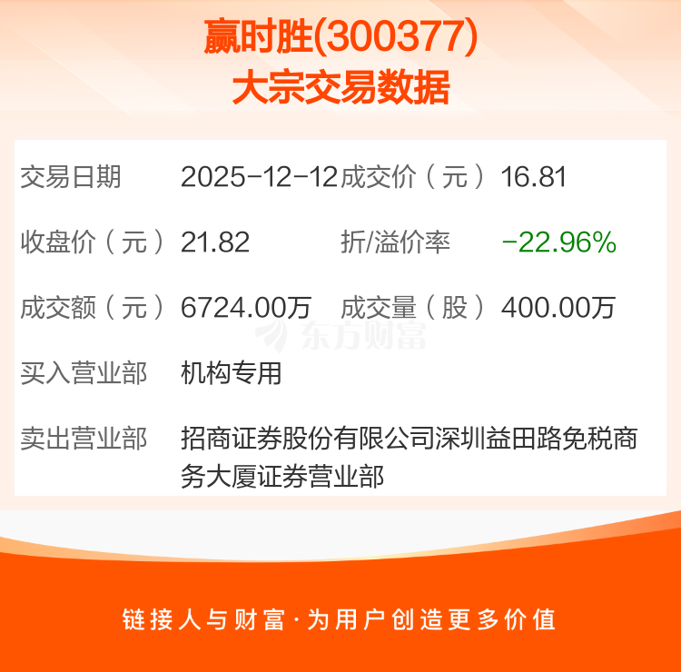 大宗交易:赢时胜成交6724.00万元,折价22.96%(12-12)