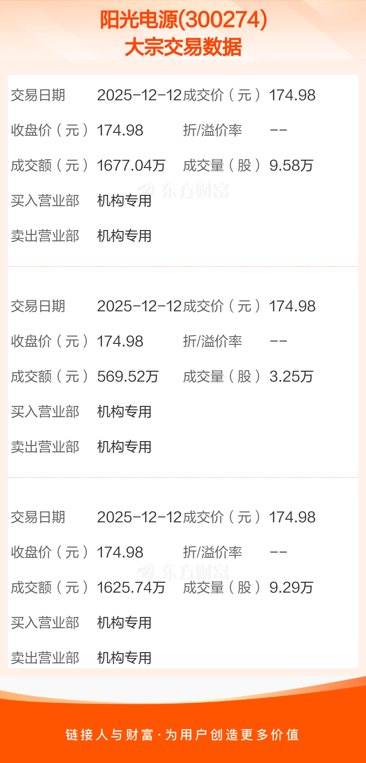 大宗交易:阳光电源成交3872.30万元,溢价0.05%(12-12)