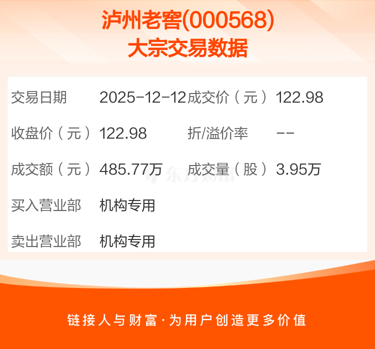 2025年12月12日,泸州老窖发生1笔大宗交易,共成交3.95万股,成交金额485.77万元,占其流通市值比例为0.00%。