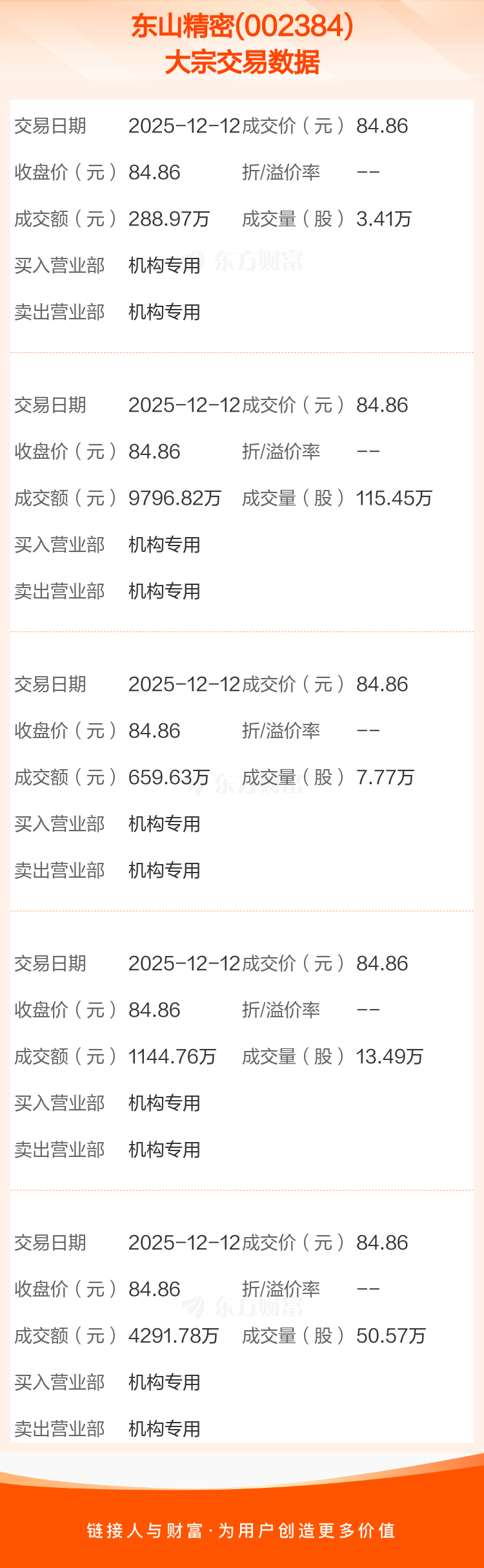 2025年12月12日,东山精密发生5笔大宗交易,共成交190.69万股,成交金额1.62亿元,占其流通市值比例为0.14%。