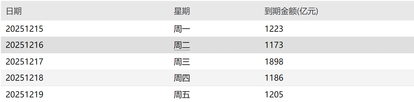 数据显示,下周央行公开市场将有6685亿元逆回购到期,其中下周一至下周五分别到期1223亿元、1173亿元、1898亿元、1186亿元、1205亿元。此外,下周一将有4000亿元182天期买断式逆回购到期、800亿元国库现金定存到期。