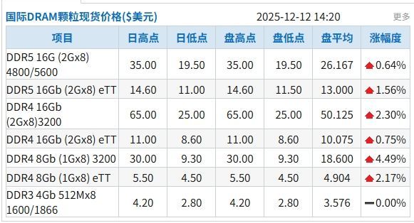 南方财经12月12日电,据集邦数据,今日国际DRAM颗粒现货价格整体涨幅略明显于前几日,其中DDR4 8Gb (1Gx8) 3200涨幅4.49%,均价18.6美元,此外DDR4两款颗粒均价破50美元,例如DDR4 16Gb (2Gx8)3200今日均价为50.125美元,DDR4 16Gb (1Gx16)3200今日均价为52美元。