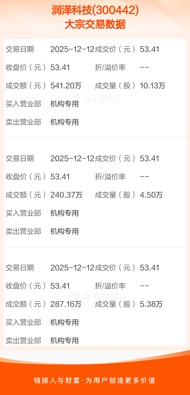 2025年12月12日,润泽科技发生3笔大宗交易,共成交20.01万股,成交金额1068.73万元,占其流通市值比例为0.01%。