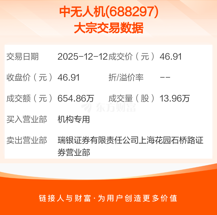 2025年12月12日,中无人机发生1笔大宗交易,共成交13.96万股,成交金额654.86万元,占其流通市值比例为0.02%。