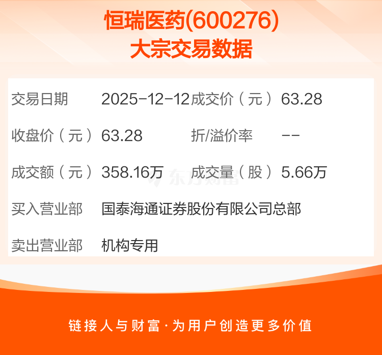 2025年12月12日,恒瑞医药发生1笔大宗交易,共成交5.66万股,成交金额358.16万元,占其流通市值比例为0.00%。