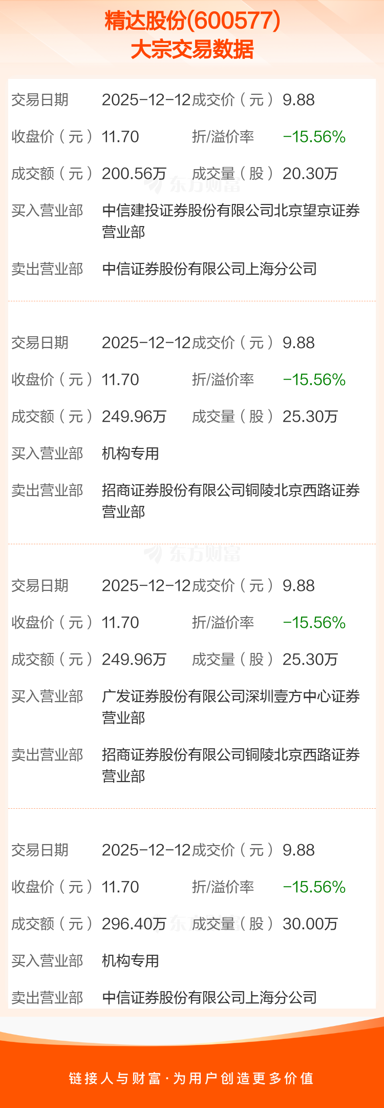 大宗交易:精达股份成交996.88万元,折价15.56%(12-12)