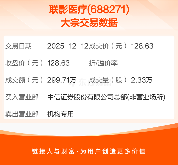 2025年12月12日,联影医疗发生1笔大宗交易,共成交2.33万股,成交金额299.71万元,占其流通市值比例为0.00%。