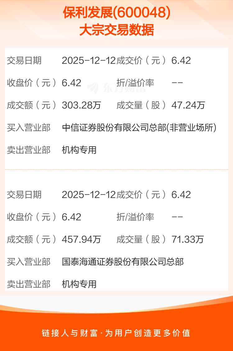 2025年12月12日,保利发展发生2笔大宗交易,共成交118.57万股,成交金额761.22万元,占其流通市值比例为0.01%。